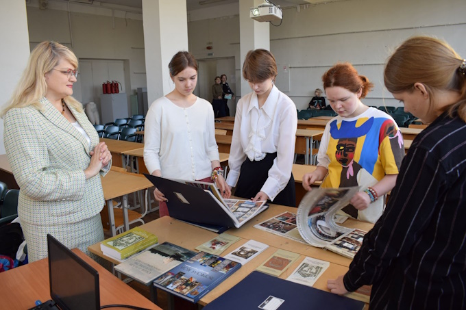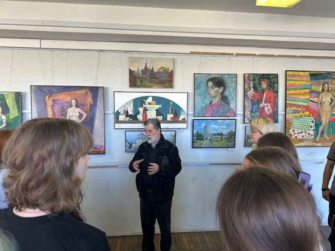 Преподаватели кафедры, профессор А. В. Белов и зав. кафедрой, доцент Д. О. Антипина, провели профориентационную беседу с учащимися старших классов: показали видеофильм из жизни кафедры, рассказали о преимуществах и перспективах профессии художника, побеседовали на творческие темы на экспозиции выставки.