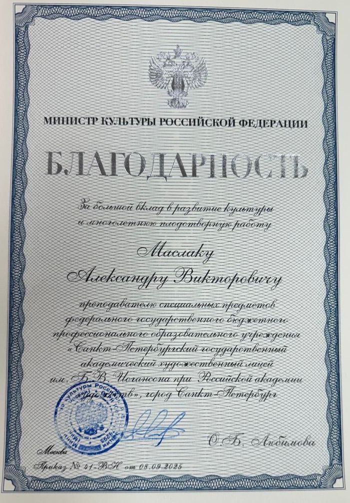 С радостью и гордостью поздравляем нашего талантливого преподавателя, Александра Викторовича Маслака, с получением благодарственного письма от Министерства культуры!