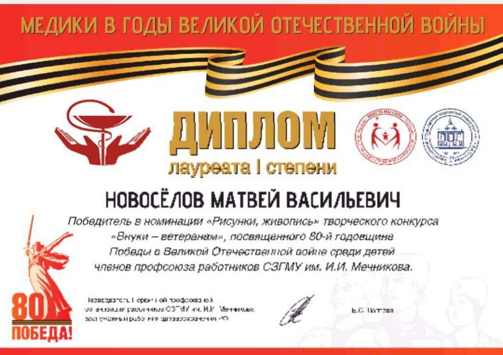 Поздравляем нашего СХШатика Матвея Новосёлова из 7 “Б” класса с победой в конкурсе, организованном СЗГМУ им. И.И. Мечникова!