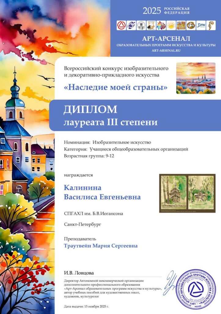 Поздравляем нашу ученицу Калинину Василису из 7 “А” класса с победой в конкурсе изобразительного и декоративно-прикладного искусства «Наследие моей страны».
