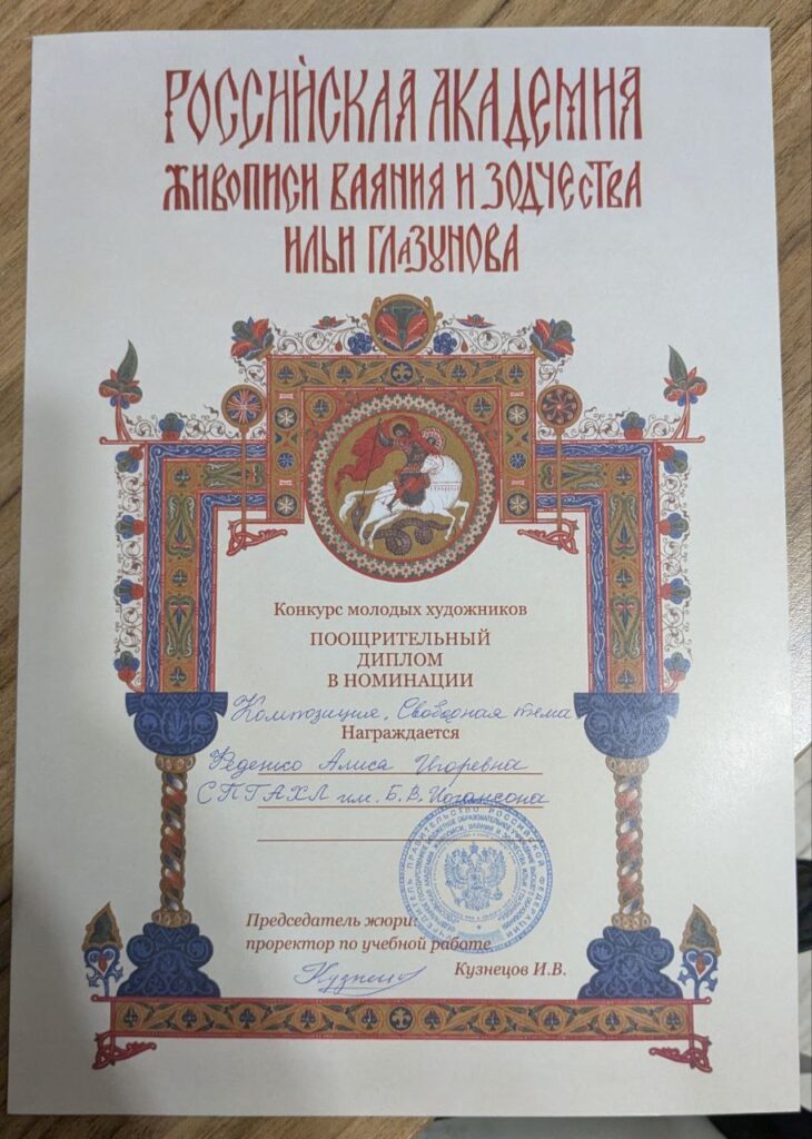 Конкурс проходил в Академии живописи, ваяния и зодчества Ильи Глазунова в Москве и собрал множество талантливых участников без возрастных категорий. Мы гордимся тем, что Алиса смогла продемонстрировать свои уникальные художественные способности и завоевать признание жюри