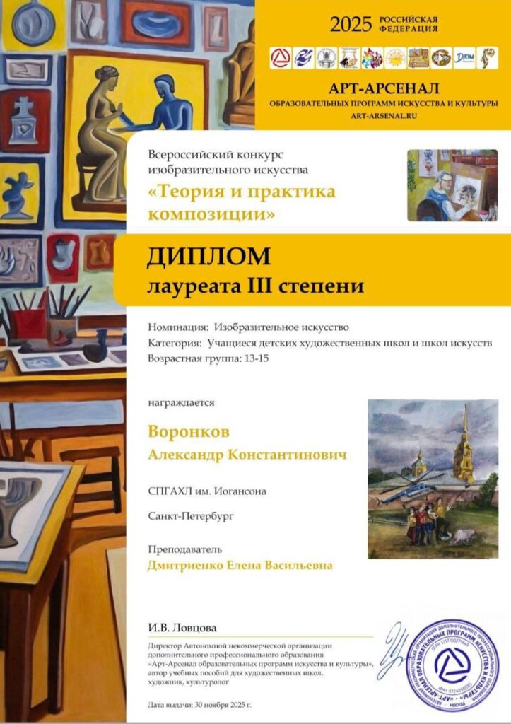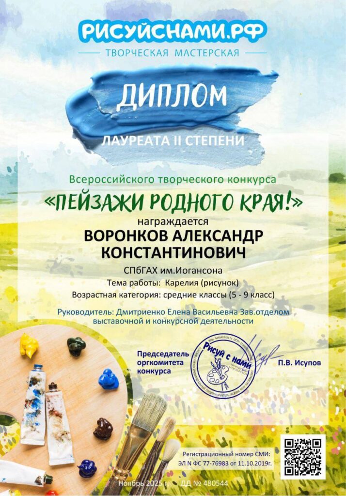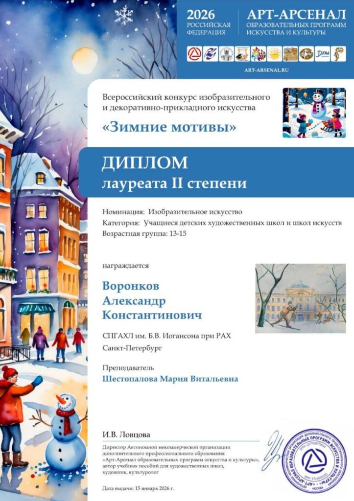 Мы поздравляем ученика 7-А класса Воронкова Александра с победами во Всероссийских конкурсах: «Зимние мотивы», «Теория и практика композиции» и «Пейзажи родного края».
